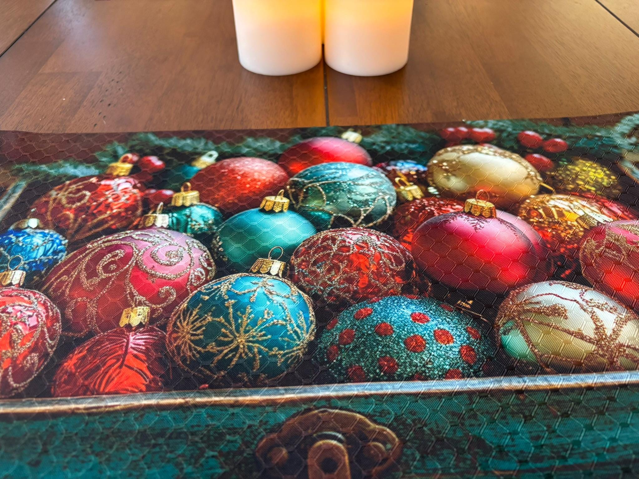 Blown Glass Christmas Balls in Wooden Box Placemat – Holiday Decor – Machine Washable Unique